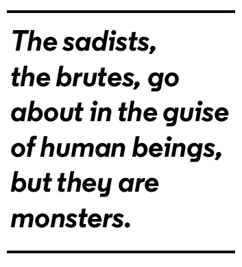In every society there are men of base instincts. The sadists, the brutes, go about in the guise of human beings, but they are monsters, only more or less restrained by discipline and social habit. If they are offered a drink from a river of blood, they will not be satisfied until they drink the river dry.