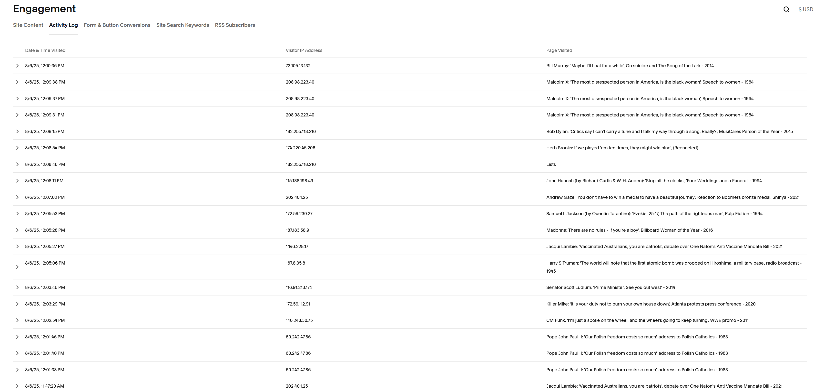 Forty seven percent of Speakola traffic originates in the USA, 10 percent in my home country of Australia. I’ve had 250 visits from Zimbabwe, 383 from Lebanon. It’s truly a worldwide resource. I’m proud of that too. I always intended to house at least one speech from every country of the world. That’s going to be a project for the next couple of years.
