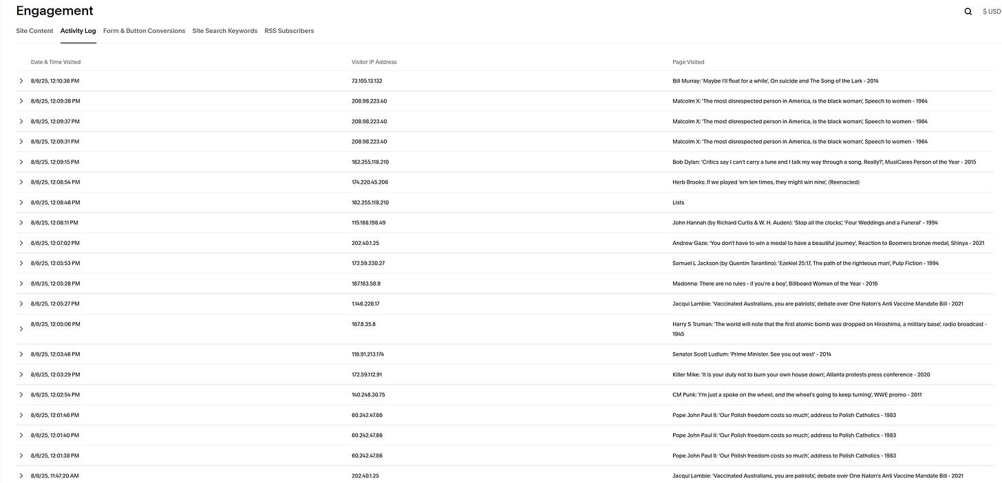 and accidentally subscribed to me to on their recommendation prompt. The rest like speeches Mike! Even in the last ten minutes, a shitload of people have visited Speakola, and here is what they are looking at: