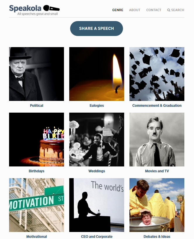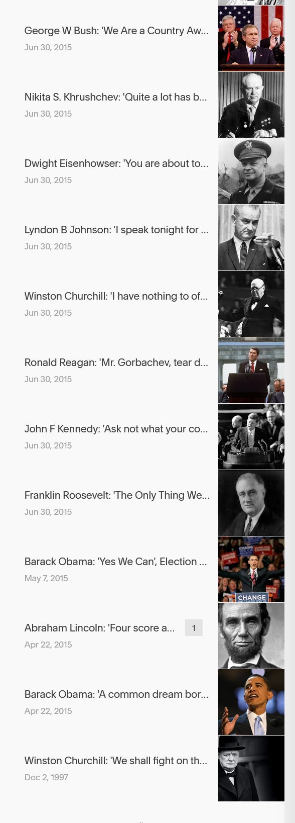 In June of 2015, I started loading famous speeches. My strategy was to look for lists already in existence – ‘The 25 best speeches of the 20th Century’ and that sort of thing. I decided that for each speech I would include speaker name, title, date, location, embed video (or photograph if no embed) and most importantly, transcript. I figured that the only thing really separating what was to become Speakola from YouTube, which also houses great speeches, was discoverability and transcript. So every time I added a speech, I either searched up text or made my own transcript, often using Rev.com.